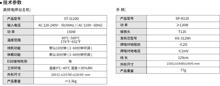 套餐包含主机一台,手柄一支,烙铁座一个,钢丝球一个,接地线一条,电源线一条,说明书一本, 应用领域9/strong> 研发技术中心,创客中心的工程师**产品 适用于家用电器,一般工业产品的焊接拆焊 广泛应用于大中型、品牌化企业生产作业 适用于高等院校的教育教学 产品特点9/strong>高频涡流发热,智能分配输出功率,最高功率不低于120W:/p> 传感器前置设计,回温极速,温度精准:/p> 三组快捷温度设置,满足不同产品的工艺参数:/p> 红外一键温度校准功能,方便产线日常温度点检:/p> 密码保护功能和按键锁定功能; 智能待机、关机功能,延长耗材寿命,节约能源; 超细硅胶手柄线,防烫防折,长时间使用不疲劳; 实时监控ESD接地功能,ESD异常提示功能:/p> 插拔发热芯,更换便捷:/p> 搁架硅胶圈,防敲,更安全:/p> 高温和低温报警功能,焊接质量:/p> 最高温度可设定500度,满足客户的特殊应用; 技术参?/strong>