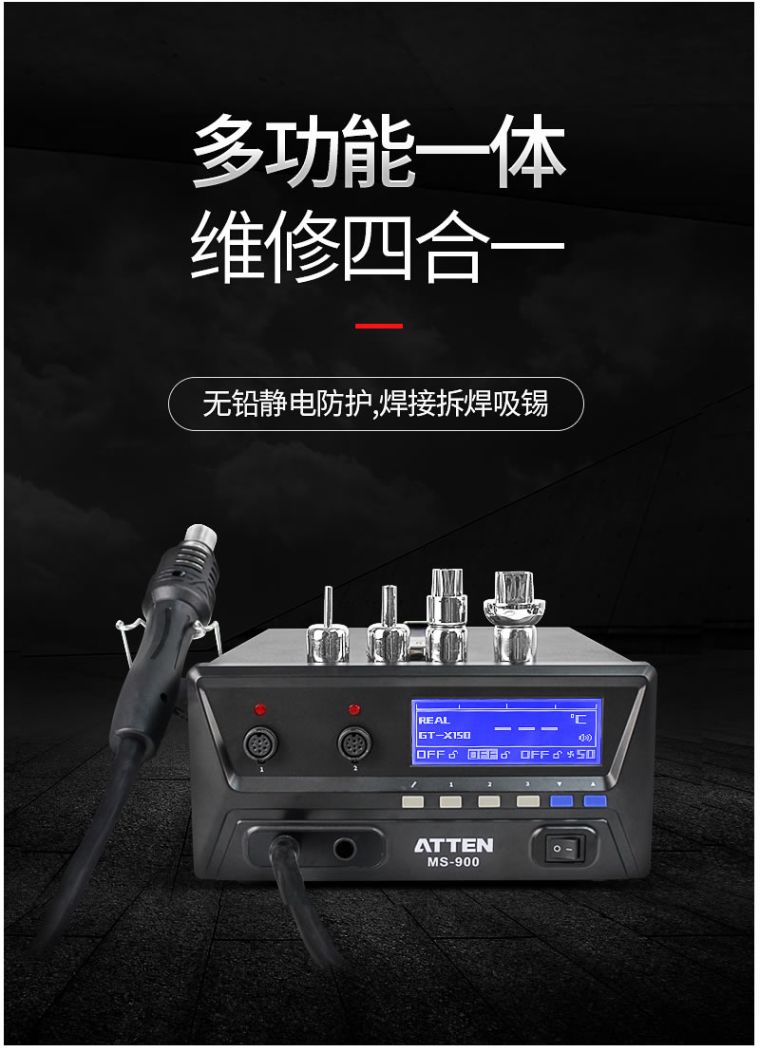 套餐包含主机一台,吸锡枪一只,拆焊台风枪一只,焊台手柄一只,电镊子一只,电源线一根,风枪支架一个,烙铁座两个,说明书一本,吸锡枪内胆一个,过滤?块,防烫垫一块,弹簧通针一根,防火?个,吸锡咀3个,喷嘴4个,螺丝2颗,吸枪?个,吸枪?个,吸锡枪O形圈3个,吸咀3个,吸盘11个,弹簧3?/p>