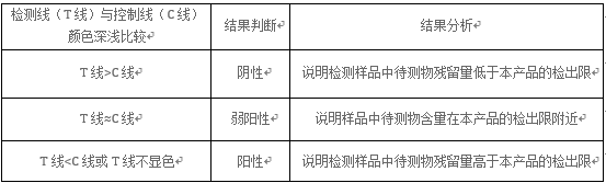 货号:YR1ZZ04-10T 一?strong>适用范围 本产品适用亍strong class="c1">淡水鱼、淡水虾、海水鱼、海水虾、鲜贝类等水产组细/strong>咋strong class="c1">猪肉、牛肉、鸡肉等畜禽组织+/strong>叉strong class="c1">鸡蛋(蛋清及蛋黄搅匀后检测)中呋喃妥因代谢物残留的现场或实验室快速检测。单个项目检测时间约25分钟、/p> 二、性能指标 产品检出限详见说明?/p> 三、储存及有效朞/strong> 2?℃避光保存,有效 12 个月。筒子开盖后取出相应数量试纸条后,请立即盖好筒盖,谨防受潮、/p> 囚/strong>?strong>产品组成 试纸? 筒,内含 10 孔红色微孔试剂和 10 条检测试纸条 其他配套试剂详见说明?/p> 亓/strong>?strong>重点抽样品种 水产品:黄花鱼、小昆鱼、鲤鱼、草鱼、彩鱼、红鱼、财鱼、鳊鱼、多宝鱼、黄骨鱼、黑鱼、鲈鱼、罗非鱼、鲫鱼、鲟鱼、海参、花甲、生蚝、花螺、沙甲、白贝、基围虾、罗氏虾、明虾、白龙虾、扁蟸/p> 畜禽肉:牛肉、猪肉、羊肉、鸡肈/p> ?/strong>?strong>辅助设备 详见说明书、/p> 丂/strong>?strong>样品前处琅/strong> 详见说明书、/p> 八、样品检浊/strong> 1. 取出相应数量的红色微孔试剂,吸取200L上述待测液于红色试剂微孔中,上下抽吸5-10次直至微孔试剂混合均匀:/p> 2. 20?0℃开?*步温育反应,幵strong class="c1">计时5分钟:/p> 3. 取出试纸筒中的试纸条,将试纸条插入上述红色微孔中:strong>20}strong>40ℂ/strong>开?*步反应,幵strong class="c1">计时3分钟:/p> 取出试纸条,轻轻刮去试纸条下端的样品垫,并于3min冄/strong>进行结果判读(超迆em>5 min判读无效)、/p> 九?/strong>』strong>结果判读【/p> (一 目测 1、控制线(C线)正常显色的情况下,按以下表格标准进行结果判断9/p> 检测线(T线)与控制线(C线)颜色深浅比较