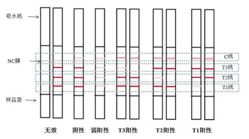 2、如果控制线(C线)和检测线(T线)均不显色,检测结果无效,建议重复测试一次、/p> 3、如果控制线(C线)显色弱,肉眼观察颜色不明显,但检测线(T线)显色正常,建议使?/p> 读数仪判读、/p> ? 若读数仪能正常读出数值,结果依旧判为阴性; ? 若读数仪无法正常读出数值,表明C线完全不显色,检测结果无效,建议重复测试一次、/p> (二)读数仪判读 1、读数仪的具体操作步骤,请参照读数仪的使用说明书、/p> 2、阴性结果R>1.1,弱阳性结 0.9≤R?.1,阳性结 R<0.9、/p> (三)判读示意图