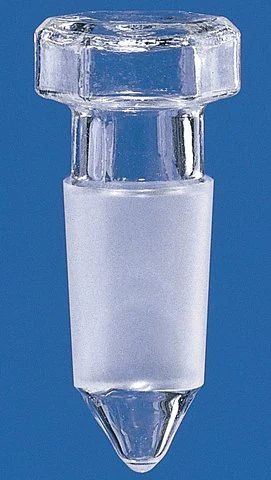 Conical ground joint stopper made from Duran?. Hollow with drip tip and hexagonal grip. Meets DIN 12 252.