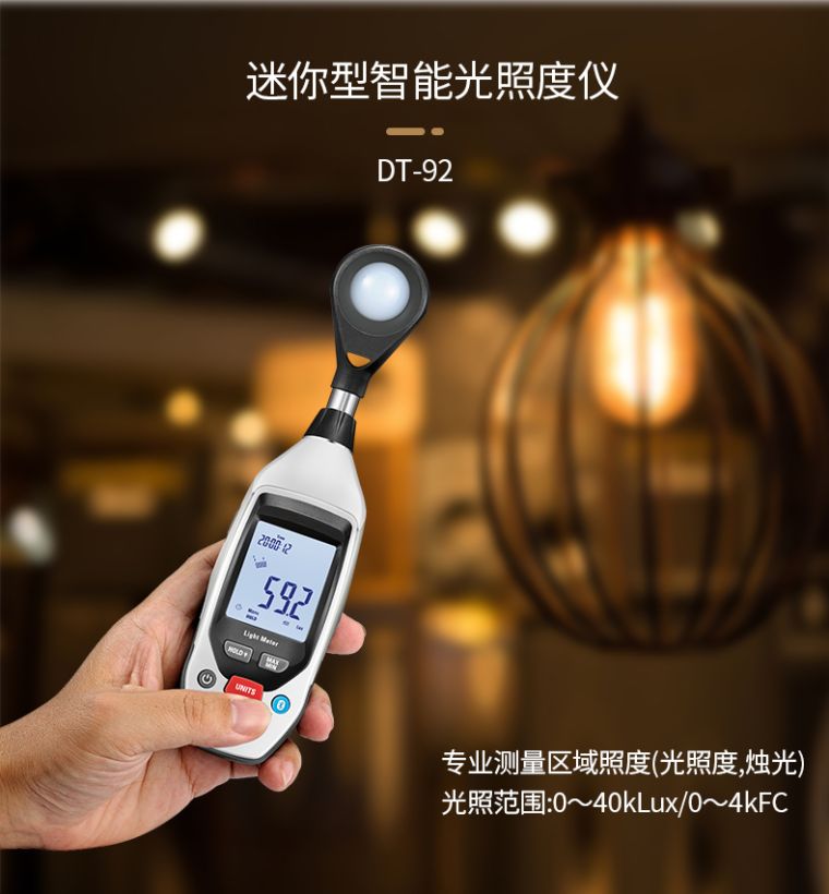 DT-92是CEM华盛昌新设计、研发、生产和推向市场的一款迷你型智能光照度仪,符合人体工程学设计,方便握持和测量,可随身携带。是一种用于测量区域照?光照度,烛光)的精密仪表。该照度计体积小,坚固,操作方便。使用的光敏元件由非常稳定耐用的硅光电二极管和光谱响应滤波器组成。针对不同角度的光输入,可进行充分的补偿和调节。带蓝牙功能,方便随时随地记录和保持数据,适合各类环境测量应用领域、/div>