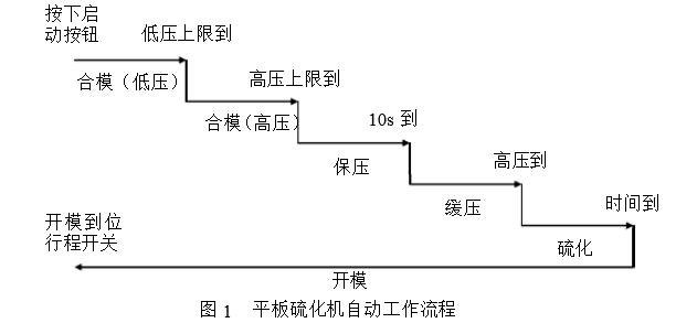 4)动作执行说明:a)合模由一台高压泵完成,由液压系统推动下方模具向上运动,当压力达到压力上限时,高压泵停止,合模结束、br/>b)保压过程中,由于在液压回路中使用了逆止阀,因此无需液压泵工作,可以保证液压系统压力,到达预制时间后保压结束、br/>c)排气过程由开合模电动机、开合模电磁阀与高压泵共同完成。进入排气阶段,先由开合模电动机、开模电磁阀完成开模泄压,当压力泄去后,高压泵通电合模加压,至达到高压设定上限,高压泵停止,反复几次(可设定)次,排气过程结束、br/>d)排气结束进入硫化阶段,在这一过程与保压过程相似,但由于时间较长(30?5分钟,要求根据材料不同,时间可调),压力会下降,当压力低于高压下限时,要求启动高压泵补压,达到高压上限停止、br/>e)开模由开模电动机、开模电磁阀完成,下方模具下降到初始位置(由开模到位行程开关控制)时,开模结束、br/>5)硫化温度所使用蒸气或油,蒸气由锅炉生产,油由电加热产生,可通过比例阀不间断通入硫化机、br/>6)系统设置总停按钮、开模指示、合模指示、硫化结束报警各一个,并具有短路和过载等必要的保护措施、/p>