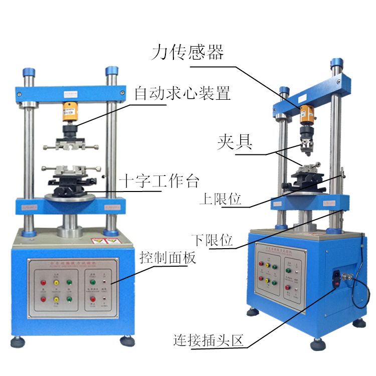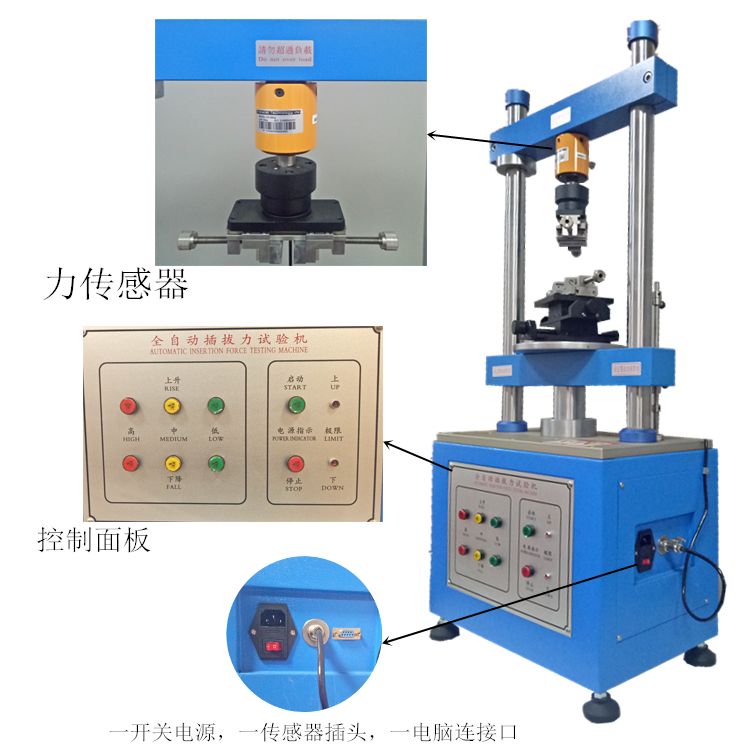 插拔力试验机适用于各种连接器之插入力及拔出力测试 , 搭配自动求心装置 , 将可得到完全准确之插拔力试验 , 利用 WINDOWS, 视窗中文画面设定 , 操作简单方 , 且所有资料皆可储 ( 试验条件、位移曲线图、寿命曲线图、检查报表……等 ) 结构