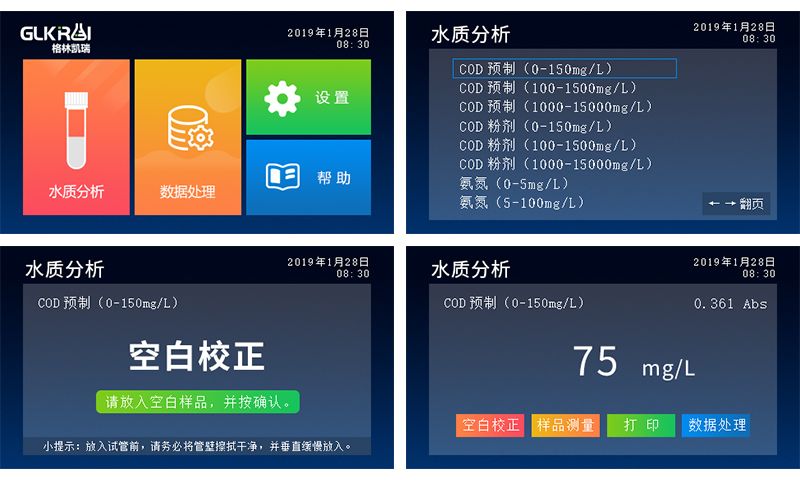 搭载Glos水质智能检测系统、每秒几十次的数据均化计算、br/>检测结果自动打印、引导检测模式等功能、br/>配备完善的耗材试剂,价格低、用量少、br/>4.3英寸高清彩屏,扁平式UI设计、br/>ABS材质,高强度、耐腐蚀、耐高温外壳、/span>