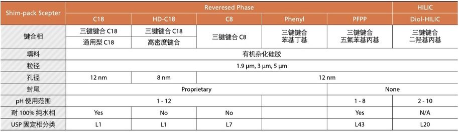 Shim-pack Scepter系列是岛津开发的有机杂化硅胶填料系列色谱柱,具有高惰性、高稳定性和高柱效等特点,该系列色谱柱可以在较宽pH值流动相范围内使用,并且具有高的耐受性。本系列有三种填料粒径可供选择?.9μm?μm?μm,不同的粒径间具有优异的再现性,可轻松实现HPLC与UHPLC相互间的方法转换、/span>