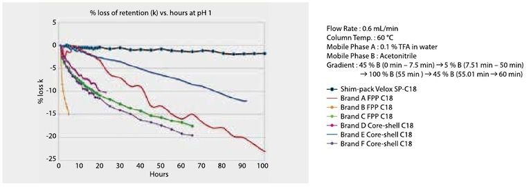 立体保护技术键合方式提供了Shim-pack Velox SP-C18色谱柱在低pH值条件优异的稳定性和耐受性,如下图显示,在pH 1流动相条件下,SP-C18相比其他品牌色谱柱表现出更强的稳定性和耐受性、/span>