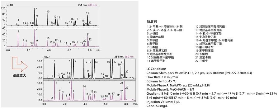 下图是采用Shim-pack Velox SP-C18色谱柱一次性同时分析食品和化妆品中常用?2种防腐剂?分钟即可完成分离、/span>