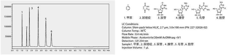 核苷由于极性较大,很难在常规的反相液相色谱柱上得到保留,采用Shim-pack Velox HILIC分析核苷则可以获得非常好的保留和分离、/span>