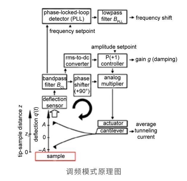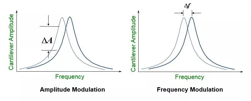 动态力模式下,探针处于振动状态,通过相互作用力对振动的影响检测力的大小。对于任意简谐振动而言(φAcos(ω?φ)),三个参数决定了振动状态:频率(ψ2πf),振幅和相位。受到作用力影响的振动探针,其振幅和频率都会发生变化。因此发展出两种检测手段:调幅模式和调频模式。锁定振动频率,测量探针与样品不同距离时振幅的改变,这种方法称为调幅模式;反之,固定振幅,测量作用力对频率的偏移作用,这种方法称为调频模式、/span>