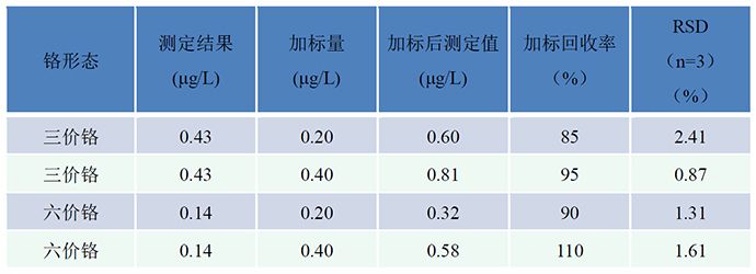 经过大厨规范化的一顿操作猛如虎之后,大爷坚持不懈势必要点的三价铬和六价铬新鲜出炉? min以内,三价铬和六价铬两种形态即可达到完全分离,其保留时间分别为三价?.084 min和六价铬2.695 min。铬形态分离色谱图及测试结果如表下所示。结果表明,各元素线性关系良好,r>0.9996,加标回收率良好,重现性RSD<3%,检出限低,三价铬和六价铬的方法检出限分别?.028 mg/kg?.025 mg/kg、/p>