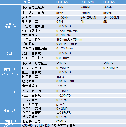 试验时侧向围压可静态或动态控制,当轴向、侧向以相同频率激振时,相位在一个周期内可进行自由调节、/p>
