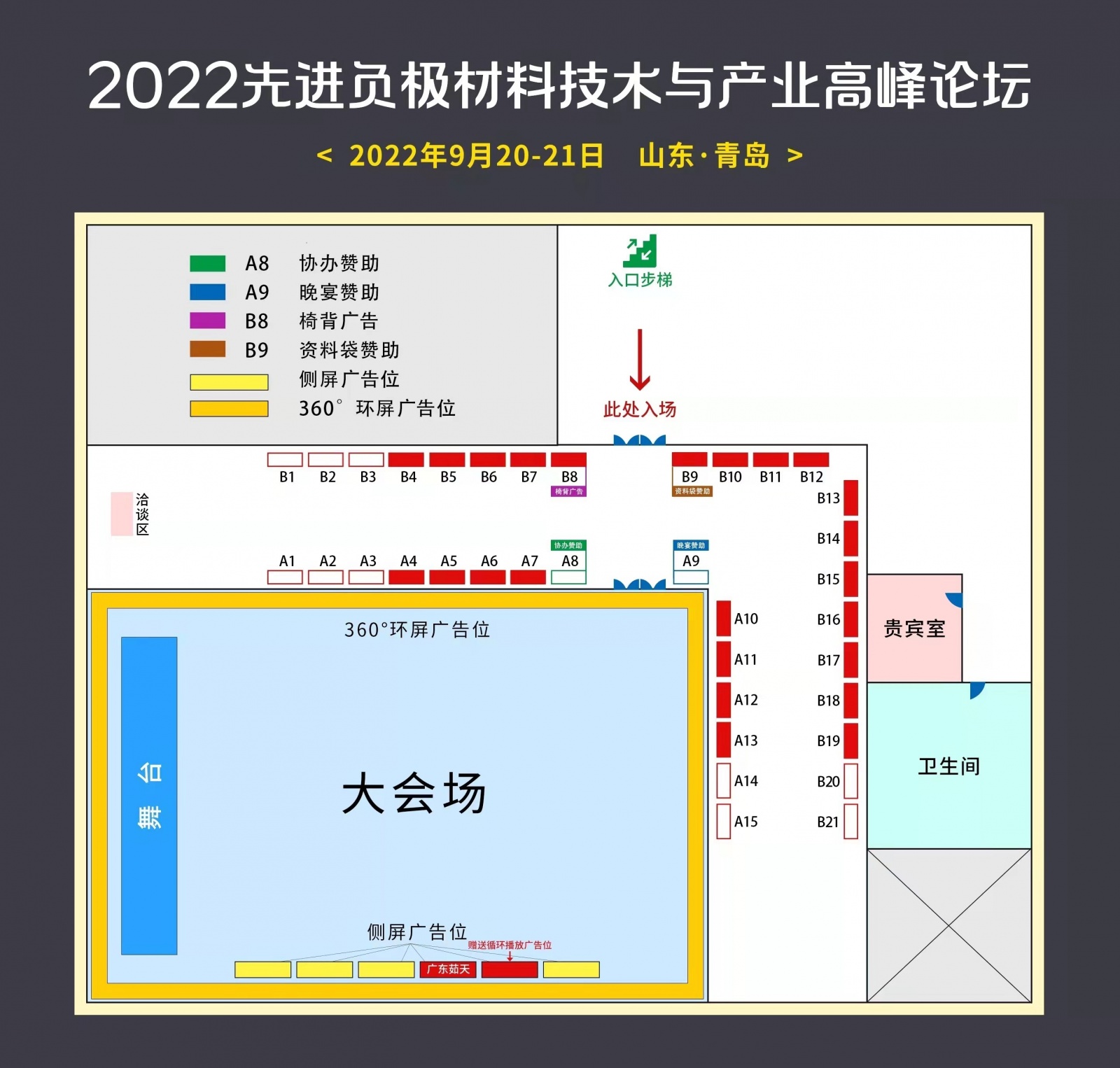 会场赞助(优势展?会场大屏LOGO展示+协办、晚宴、巨幅广告、椅背广告、茶歇、胸牌、礼品……)