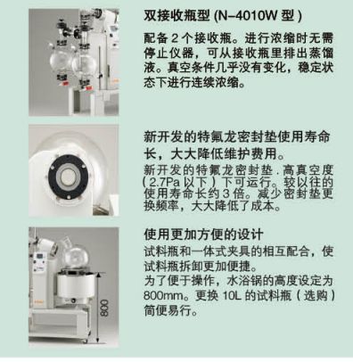 规格参数 产品特点 1 占地面积仅为1060W×550Hmm,标准配?0L试料瓶,节省空间型设计。如果浓缩样品少,可选购10L的试料瓶进行替换、/p> 2 加热用恒温水浴槽为水油两用型,对于高沸点的溶剂也可以进行浓缩、/p> 3 真空控制器录入了55种溶剂及相应程序,这些溶剂都是符合环境标准规定的溶剂。不同溶剂对应相应的真空度进行控制,可以有效地进行溶剂回收、/p> 4 用附带的专用电源线将N950型隔膜真空泵和N-4000型旋转蒸发仪连接进行浓缩时,隔膜泵会根据旋转蒸发仪的运行状态自动运行、/p>