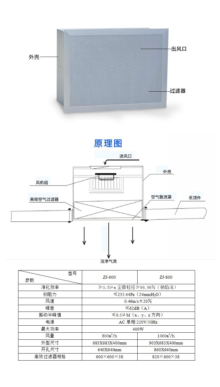 ZJ系列空气自净器是一种提供局部洁净工作环境的空气净化单元。由初效空气过滤器、风机、高效空气过滤器及静压箱组成。外壳采用钢板喷塑处理,箱体内覆盖海绵、整机噪音低、结构简单、使用方便,安装可进行室外空气自循环。空气自净器是一种简单的室内净化送风设备、/p>