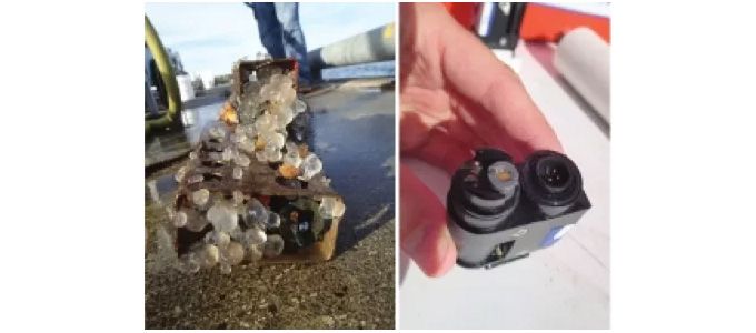 上侧的照片显示的是抛放在Shilshole湾的仪器的外观和pH传感器从仪器的内部流通池上拆下来的样子。HydroCAT-Ep的内部的泵和流通池可以保护pH传感器免于逐步累积的生物的生长,因此限制了因生物玷污引起的漂移、/p>