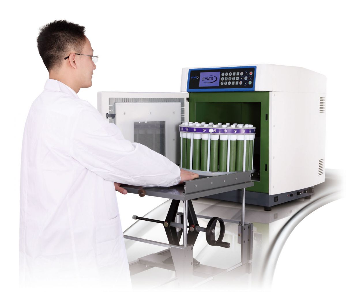 5.15分钟消解罐快速冷即/strong> 由于复合纤维材料的高热导性能,结合消解仪高速风冷风道设计,?00度降?0度只需15分钟,就可以打开消解罐,大大加快批处理速度、/span> 6.各种配套操作工具,让高通量消解的操作轻松简協/strong> 多种便利的辅助操作工具,减轻操作人员的工作负担,提高样品前处理的效率。如机动灵活的工具小车,帮助实验人员轻松将装满样?载重15