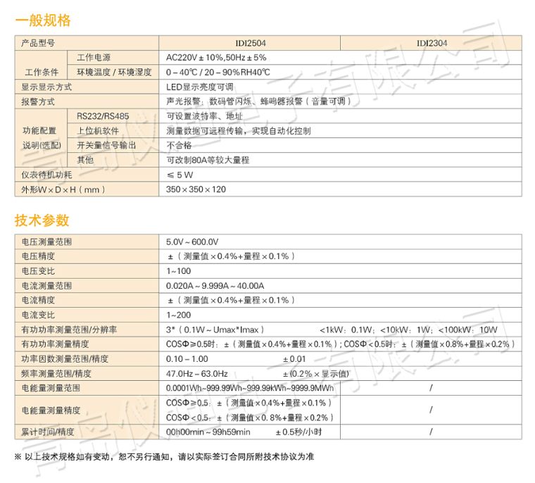 功能特点9/strong> 1.精度?.5级; 2.电压、电流、功率可设置上下限报警,电能量可设置上限报警:/span> 3.可设置电压、电流变比,轻松扩展测试量程:/span> 4.显示亮度和蜂鸣器音量可调,更人性化:/span> 5.可切换不同的线制:/span> 6.断电后开机可保持断电前状态; 7.可选配RS232?85通讯,设置波特率及地址,实现数据远程传输处理、/span> 技术参?/strong>