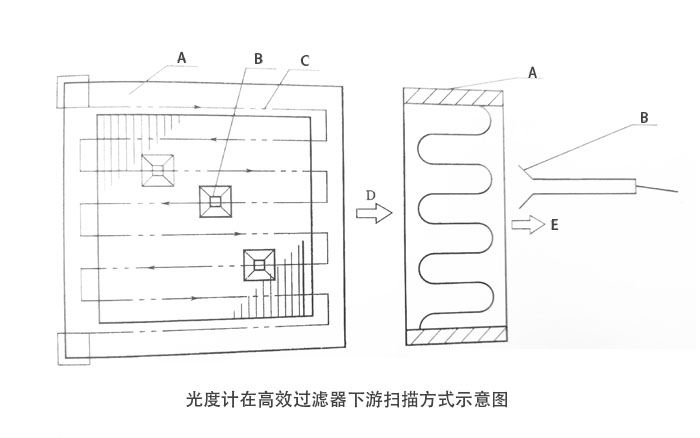 测试方法具体如下9/p> 1、PAO经气溶胶发生器发散成烟雾状气溶胶,注入高效过滤器上游静压箱、/p> (注:在过滤器上游测PAO浓度一般为10?0μg/L即可,也可为30?0μg/L;PAO浓度较高时,PAO有可能粘在HEPA的滤料上,反而影响使? 2、光度计采集上游气溶胶浓度,采样头逐行扫描过滤器下游表面,检测泄漏率。光度计在高效过滤器下游扫描方式见下图、/p>