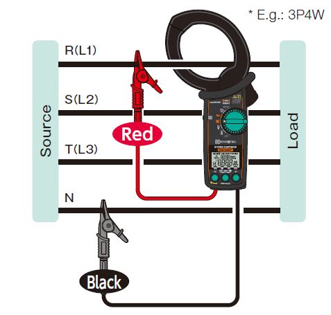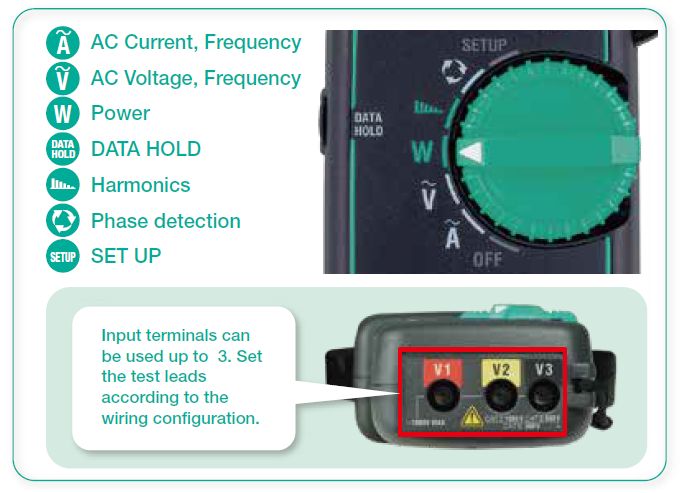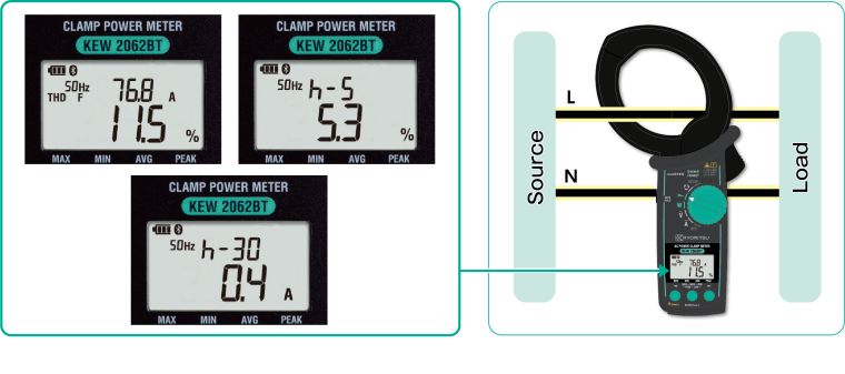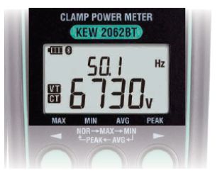 2.功率测量 可以在任何布线系统上进行功率测量. KEW 2062可以单相2?单相3线和三相3?三相4线的平衡和不平衡测量 双屏可同时显示W & PF, W & deg, W & VA, W & Var, V & A,等参?