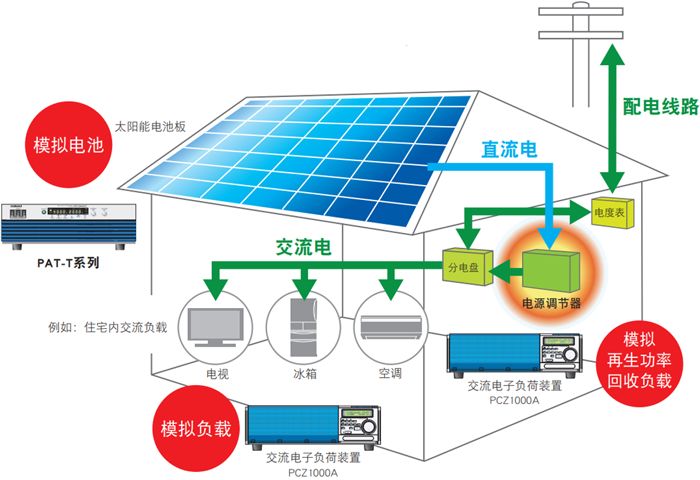 太阳光发电相关应用案 ──用于功率调节器简易评件/span>在同一时间轴上按时序控制太阳能电池板,住宅内负载,AC线路,模拟长时间的变化情况、/span>