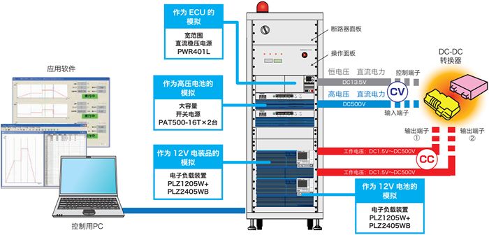 DC-DC变换器评价系统例本系统是由直流电?台与电子负载装置2台所组成。使用专用的控制软件,就可以容易的对车载电器的动力电源DC-DC变换器进行性能评价、/span>