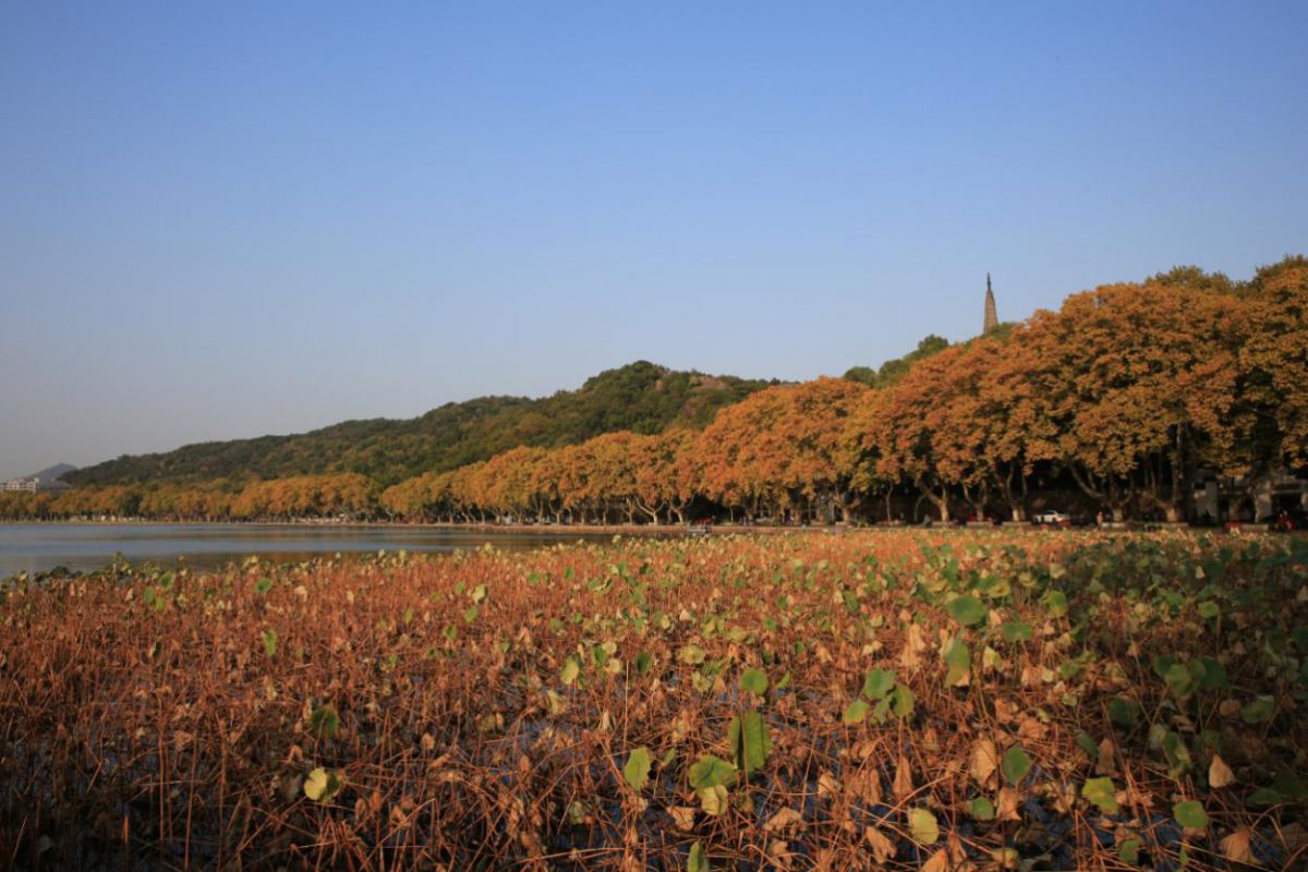 草坪上满是金黄色的落叶,仿佛在低声呢喃,诉说着西湖四季的故事、/span>