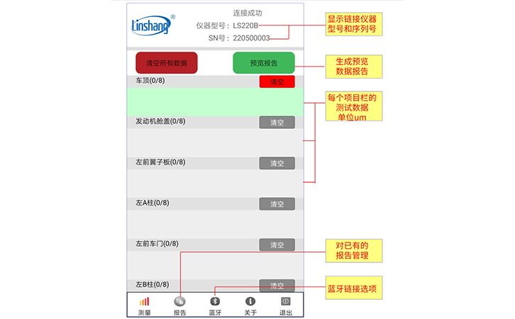 4.二手车漆膜仪具有蓝牙功能,可连接手机软件,软件针对汽车不同部位如:汽车车顶、发动机舱盖、左前翼子板等共?7个项目,每个项目可保??*的测试数据,并且显示每个项目栏的基材类型,还能生成测试报告、/span>