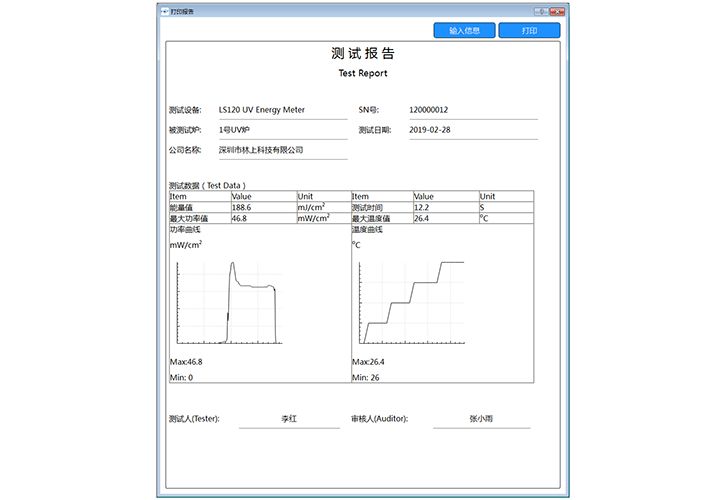 LS120UV能量计是可以同时测试能量,功率,温度,时间,具有曲线显示,导出数据和打印测试报告等功能的国产UV能量?是一个真正敢提并做到"无理由一个月全额退?quot;保障的产品,一款可直接和美国EITUV能量?对比测试结果) ,日本ORC UV汞灯能量计媲美的产品。LS120UV能量计,开创了UV能量计业界的众多**9br/> **台能显示温度曲线的UV能量讠br/> **台具有温度和功率实时值测量功能的UV能量讠br/> **台内置计时器,精确记录固化时间的UV能量讠br/> **台能记录6万条数据的UV能量讠br/> **台能通过USB连接电脑打印测试报告的UV能量讠br/> 同类型紫外线仪器选型请参考:《紫外线仪器选型表《/p>