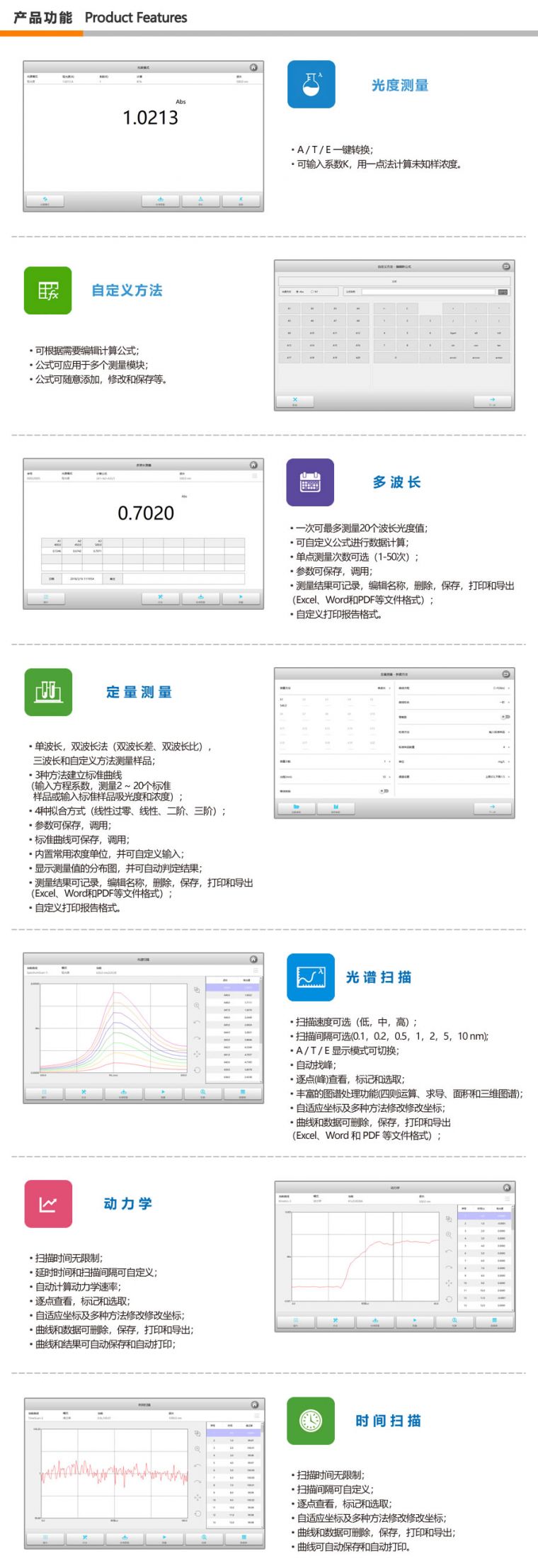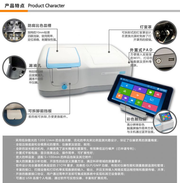 P6 双光束监 紫外可见分光光度计。通过简单的参数设定,方便地进行光度分析、定量分析、动力学测试,配合专业的Mapada的扫描分析软件,可实现全波长光谱扫描、多波长测试、/span>