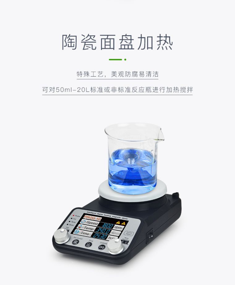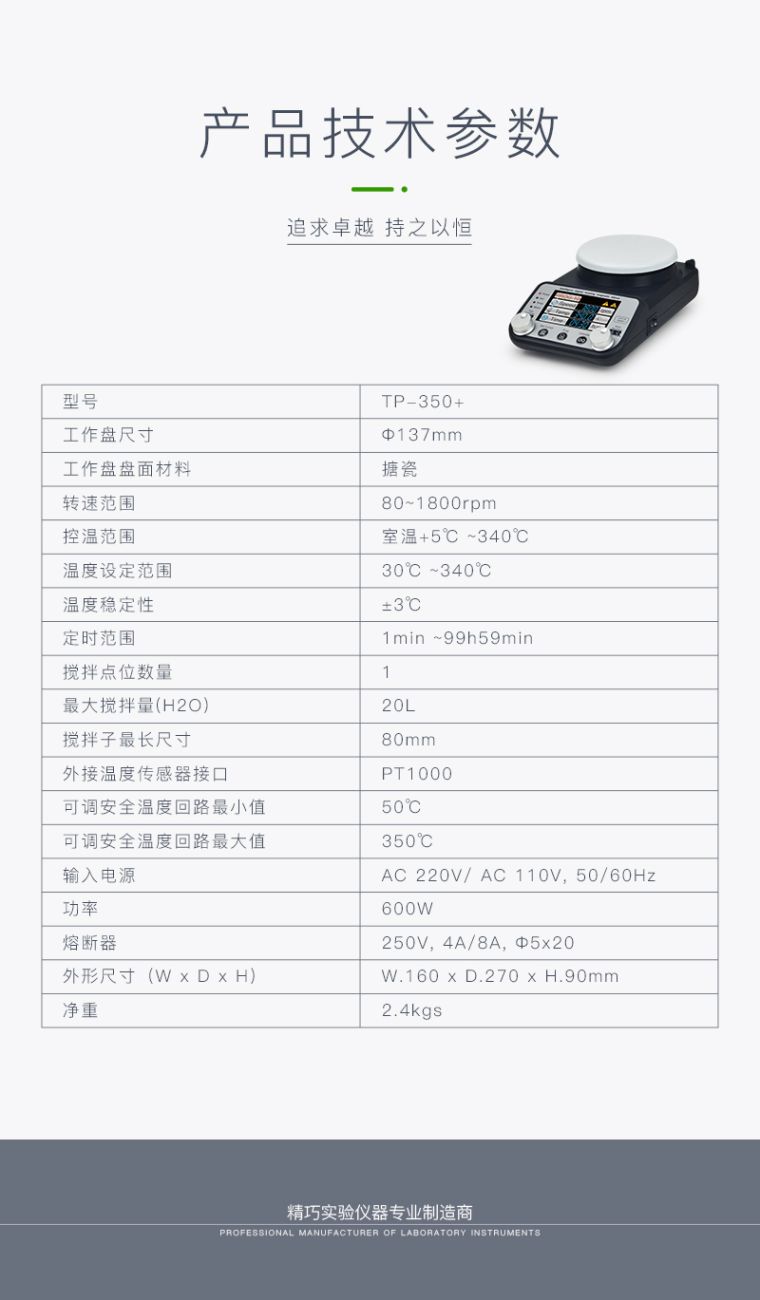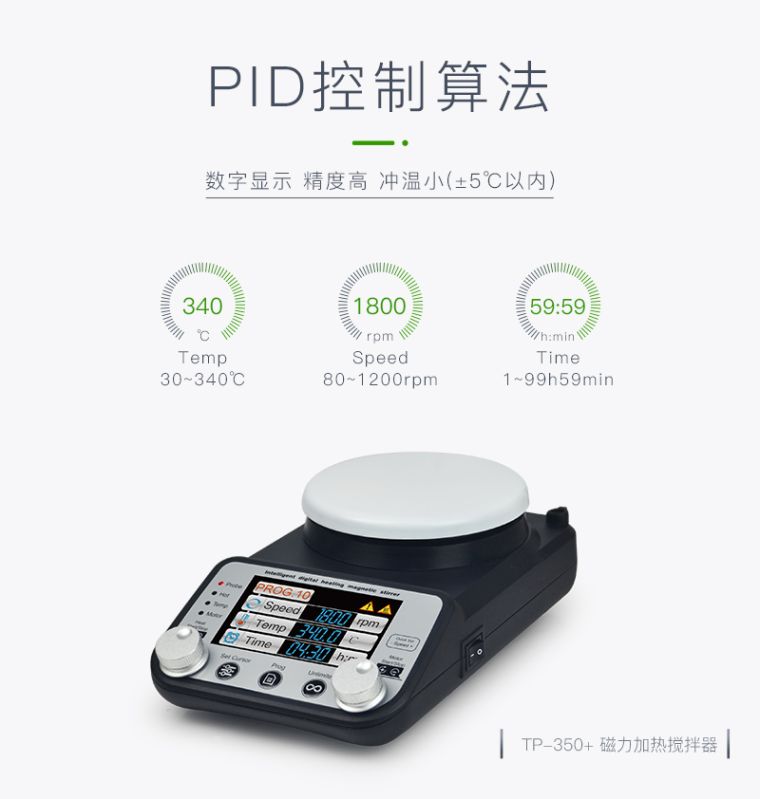 TP-350+ 磁力智能彩显加热搅拌器采用特制陶瓷盘加热技术,表面最高温度可达到340℃。磁力搅拌子搅拌技术,人性化操作设计,可满足多种加热搅拌实验需求、/p>