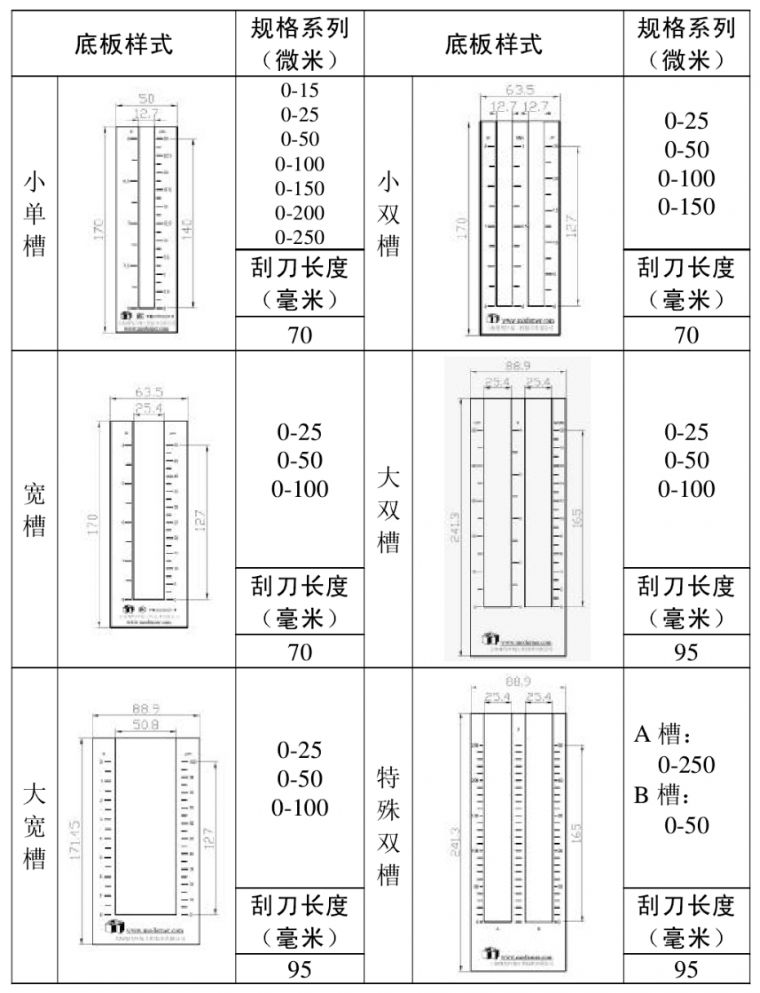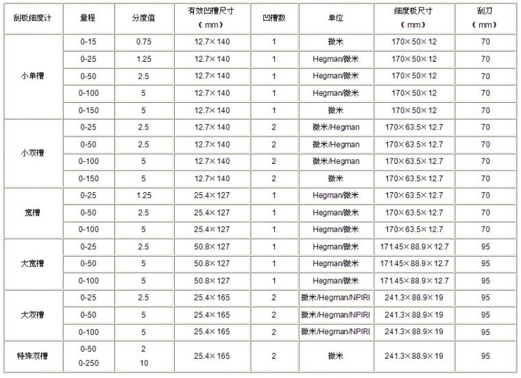 刮板细度计规格览表: