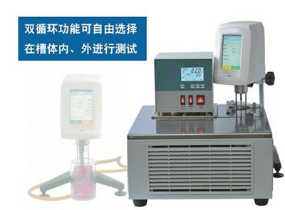 本仪器的制造符合中华人民共和国计量检定规程JJG1002-2005《旋转粘度计检定规程》所规定的要求,测定旋转粘度计在某一恒定温度条件下的检定。台式低温恒温槽是自带制冷和加热的高精度恒温源,可在机内水槽进行恒温实验,或通过软管与其他设备相连,作为恒温源配套使用。方孔侧边式设计,特别适用于各种厂家旋转粘度计的检定需求、/p> 一、主要功能特炸/strong> 1、高精度旋转粘度计检定恒温槽采用成/p> 公司自行研制的恒温槽专用AI人工智能PID调节斸/p> 法的高精度控温仪表、/p> 2、在控温的全量程范围内,线性非常好,控温显示精?.01度, 控温误差小于0.1℃,温度波动度小?#177;0.03度、/p> 3、面板一改以往的惯例,没有一个机械开关,防水效果 好。整台恒温槽只有一个电源开关在控温箱的背面、/p> 加热、制冷都是全自动控制,无须人为干预。工作效 率更高、使用更可靠、/p> 4、液体的粘度,无论是牛顿液体还是非牛顿液体,都与温度相关,通常是随着温度的上升而下降。为了准确测量试样的粘度,首先需要考虑控制试样的温度,大多数试样的粘度对温度的变化非常敏感、/p> ?示意图是恒温槽和粘度计直接配套使用或用外循环的方法连接恒温杯。专门使?00ml的高烧杯,放于恒温槽的方孔内并可用固定装置夹住。又可以既在水槽内直接进行恒温试验,也可以利用外循环功能,通过软管和恒温杯连接,将槽内受控的恒温液体的温度传递给被测样品、/p>