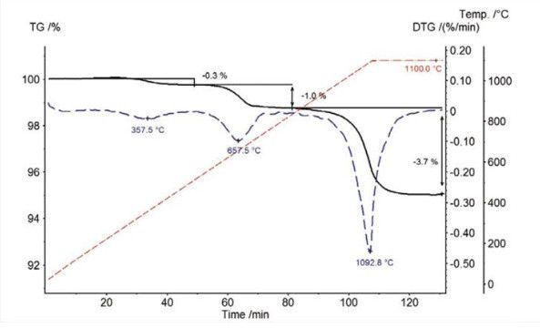 TGA 测试分析显示出在较低温度下云母脱水和脱羟基的失重过程。TG 209 F1 Libra? 配备新型的陶瓷炉体,具有宽广的温度测试范围,最高温度达 1100℃,能够观察到云母在 1093°C 的特征失重温度、/p>
