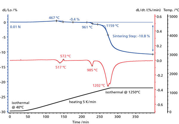 在瓷器生坯的加热过程中,高岭土的脱羟基过程发生在 450°C 570°C 之间,在这个过程中形成了莫来石结构(热膨胀的峰值温度为 467°C(蓝色曲线),对应一阶微分曲线上的峰值温度为 517°C(红色曲线))。在这个温度范围内,由于粘土晶体结构中结晶水的释放从而导致了样品大约 0.4% 的收缩。一阶微分曲线上峰值温度为 572°C 的峰体现了石英α晶型→β晶型的转变。通过进一步观察, 961°C 发生的效应(蓝色曲线),对应一阶微分上峰值温度为 985°C(红色)的峰是由于高岭土结构的破坏和 γ-Al2O3 的形成[1]。随着长石的完全熔化和莫来石的形成?159°C 开始的两个烧结步骤的总收缩率 10.8%、/p>