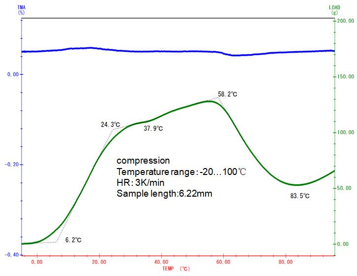 随着温度的上升,样品的自然膨胀趋势越来越大,要维持固定的压缩形变量所需的力也相应增大,直至 58°C 起样品发生玻璃化转变之后,样品模量下降,所需的负载力才相应下降、/p>