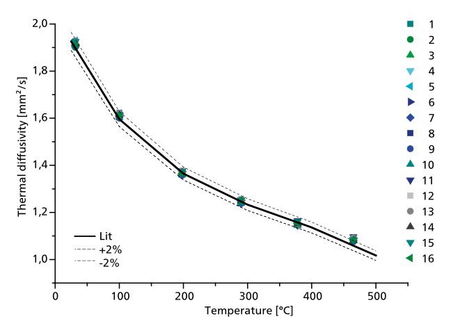 LFA 467:在一次测量中即可完成全温度范围的热扩散系数测试、br/>图中样品 Inconel 600 标样,实线为文献数据、/p>