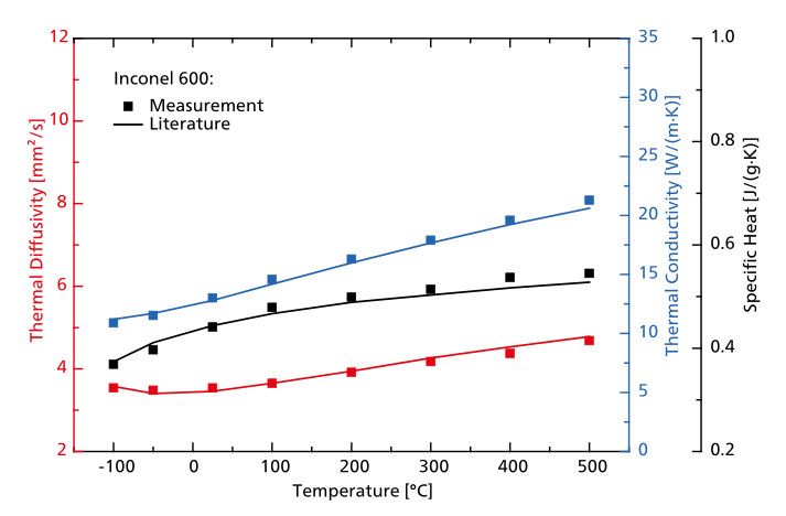 图中曲线为标 Inconel 600 的热扩散系数(红点)、导热系数(蓝点)和比热(黑点)测试结果。测量覆 LFA 467 HyperFlash?完整温度范围?100 500℃)。与理论值(实线)相比,实测数据点的偏差均小于?%,精度水平普遍好于?%、/p>