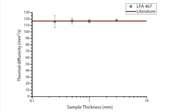LFA 467:不论样品的厚薄程度,测试得到的铜样品的热扩散系数与理论值都十分吻合