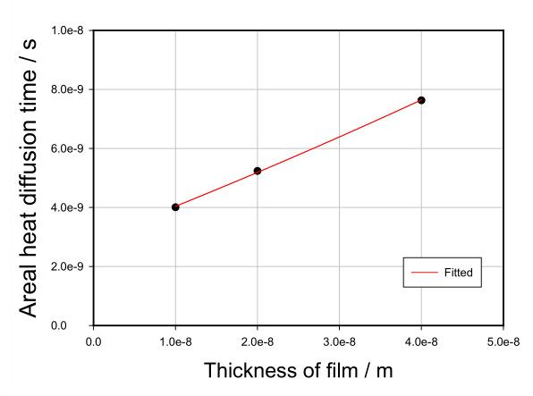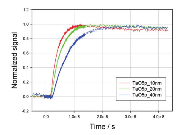 RF 模式下,不同厚度 TaOx_5p?%氧化物)薄膜的测量曲线。可见即使薄膜厚度低 10nm,仍然可以得到良好的信噪比。且不同厚度的薄膜得到的面热扩散时间数据符合线性关系、/p>