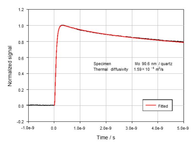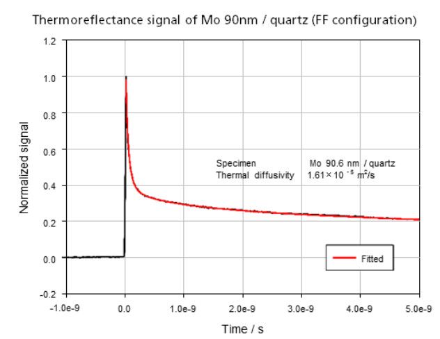 以下两图分别使用 RF FF 模式,对石英基片上的 90nm 厚的 Mo 薄膜进行了测试。两者的测试结果完全一致,平均值为 16.0 mm2/s、/p>
