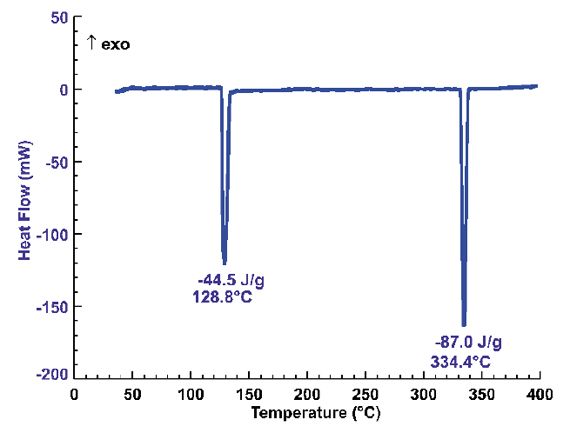 硝酸钾(KNO3)常用于火药(主成分硫磺、碳、硝酸钾)的合成。它也被用于食品保存(E252),及作为重要的含钾与含氮的肥料。测量使 200 mW 的恒定输入功率,在扫描模式下进行。在 129°C 334°C 观察到了两个与相变有关的吸热效应,热焓值分别为 -45J/g -87J/g、/p>