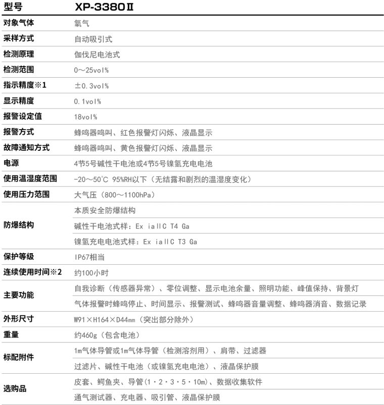 检测对豠/span> 氧气检测范図/span> 0?5vol%检测原琅/span> 伽伐尼电池式采样方式 自动吸引弎/span>应用行业 石油化工、钢铁、半导体制造、机械制造、土木工稊/span>产品描述:检??5vol%的氧气浓?/strong> 01.产品特点 ·检??5vol%的氧气浓度,通过报警音和报警灯报?/span> ·彩色条形图及数字显示,可轻松读取气体浓度。可切换为趋势图显示 ·防水、防尘构造相当于防护等级IP67 ·本质安全防爆结构 ※传感器部采用耐压防爆构速/span> 02.产品用逓/span> ·气罐内、共同沟内、隧道等地下工程现场中作业前的安全确认以及确保作业员安全 03.产品参数