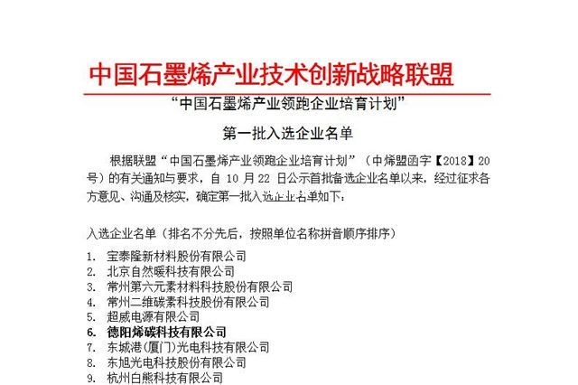 根据联盟“中国石墨烯产业领跑企业培育计划”(中烯盟函字?018?0号)的有关通知与要求,经过报名、筛选、审核、公示等程序,选出适合企业,中国石墨烯产业技术创新战略联盟将与入围企业开展深度、多层次、全方位的战略合作,培育石墨烯产业领跑者,带动中国石墨烯产业健康发展。入围首批企业名单共25家,德阳烯碳科技有限公司赫然在列、/p>