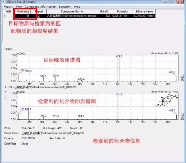 4、数据库中还提供了MS Library,其中包含了兽药的二级质谱库文件及化合物的结构图。质谱库中包含了二级质谱图以及化合物的各类信息,用户可以根据目标化合物的二级质谱图进行质谱库的检索,依据谱库筛选出的化合物的质谱图匹配度对目标化合物进行定性,同时得到该化合物的各类信息。本质谱库可以使用LabSolutions软件进行扩展、/span>