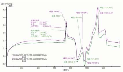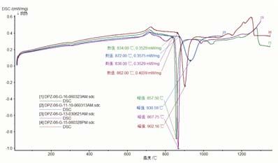 ?不同批次玻璃样品的DSC曲线图,从图示上可看出,不同配方玻璃在熔制过程中的不同阶段的温度特性,它可以提供快速准确的熓/span>制工艺和热处理温度。并由此选择更好的配方和工艺、/span>