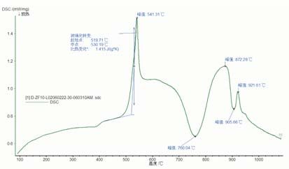 ?是D-ZF10玻璃样品的DSC曲线图,由图可得:它的玻璃化转变起始点温度是520℃,峰值温度是 541℃,用膨胀仪测得的Tg?07ℂ/span>,Ts?48℃。对应于它的退火测试温度为?91℃,应变点测试温度为 459℃。对应于它的晶体温度测试区域,析晶上限温度为1100ℂ/span>,较严重析晶温度?000℃,最严重析晶温度?10?用玻璃在1200℃保?小时,取出自然降温的方法测试它的析晶情况)。从以上数据与DSC曲线图上的对应区域温度相比较,可以看出DSC分析测试的参考价值、/span>