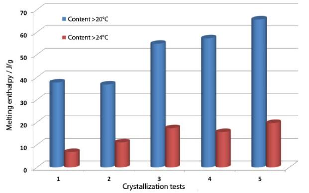 巧克力生产过程中,需要对液态巧克力进行加压热处理,以抑制可可脂其他晶型的结晶,获得高熔点的β晶型。通过DSC可以部分的模拟这种处理过?不包括加压部?,图5显示了不同热处理工艺?0℃以上和24℃以上熔融部分的比例变化。结晶测?为以5K/min线性降温的结果;测??则变换不同的回火温度(1)以及使不期望晶型熔化的温?2)。其中测?的结果显示,与线性降温相比,通过该回火工艺处理后样品的结晶度显著增加,图6显示了相应的温度程序?4℃恒?0min后再升温?0℃、/span>