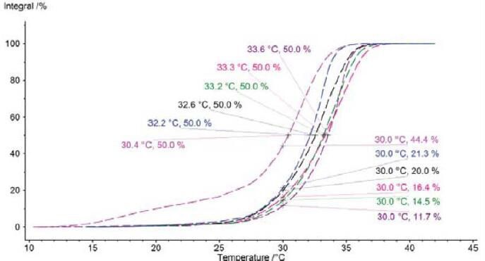 熔融峰面积可以定量不同巧克力样品的熔融行为,通过峰的位置和形状,还可以确定熔融温度范围及熔融过程。对于单个样品,还可以得到某一温度下可可脂的固体比例和熔融比例,即固体脂肪指数(SFI),SFI值从0%?00%即相应于DSC峰面积积分曲线。图8显示的是所研究的巧克力样品的积分曲线,通过曲线既可以清楚地看到熔融50%时的对应温度,也可以知道某一温度(图中示例?30?下的熔融比例、/span>