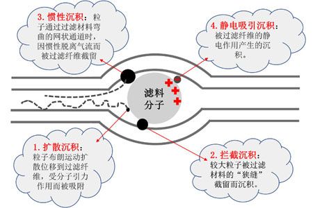 首先,口罩是由多层滤料分子构成,从图中的口罩表面显微成像可以看到,口罩结构中有大量棒状的纤维结构,这也就意味着气溶胶颗粒在口罩里不是走直线的简单过程,而是在过滤层间扩散、沉积、吸附的复杂过程。具体有如下几种机制9/p>